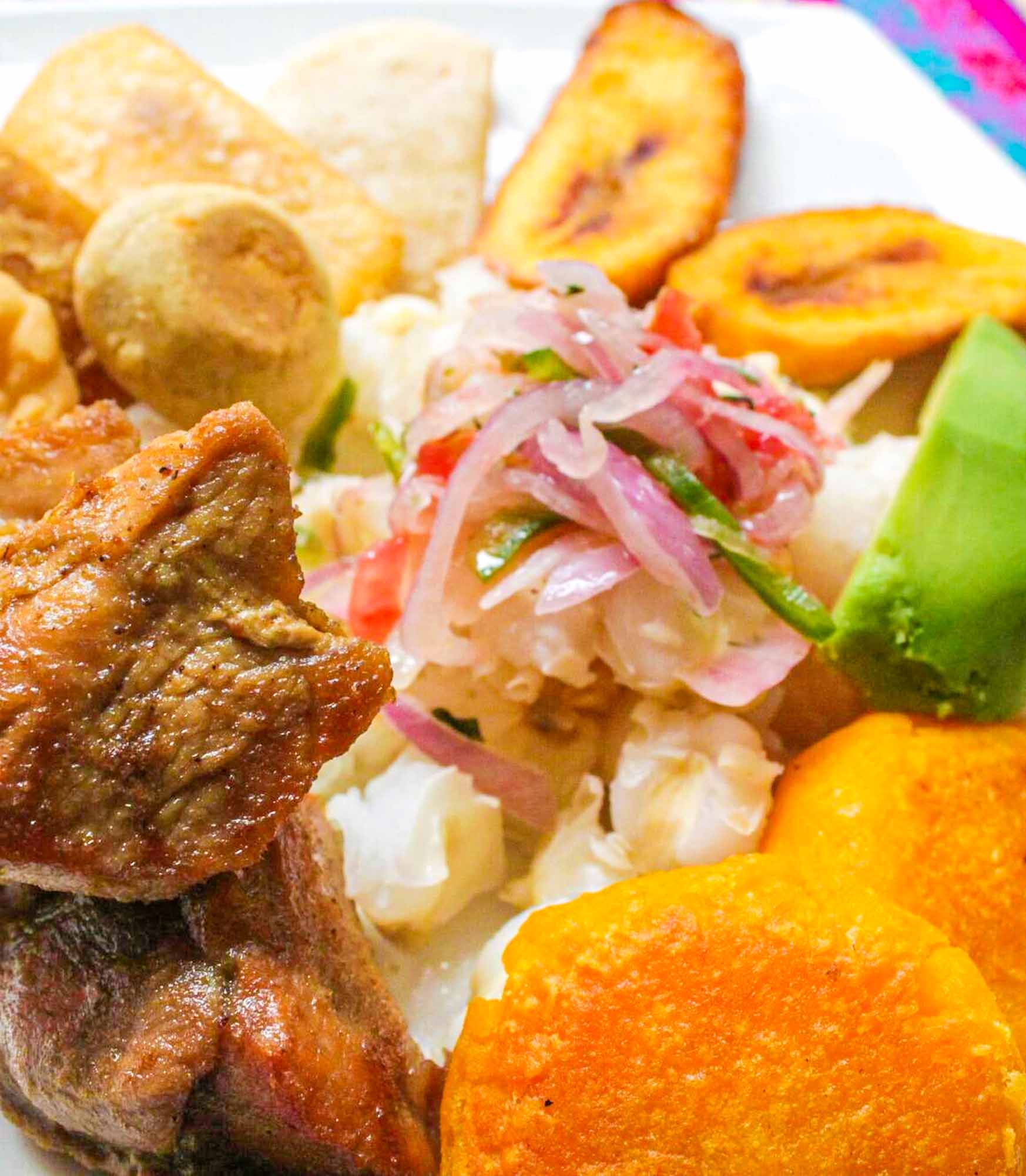 Las tortillas con fritada (Juan Acurio) es un plato especial del restaurant al pondo, su componente principal es la carne de cerdo frita, va acompañada con tortillas de papa, mote, tostado, plátano y su respectivo agrio (Ensalada agri-dulce de tomate, cebolla, zanahoria y picadillo).